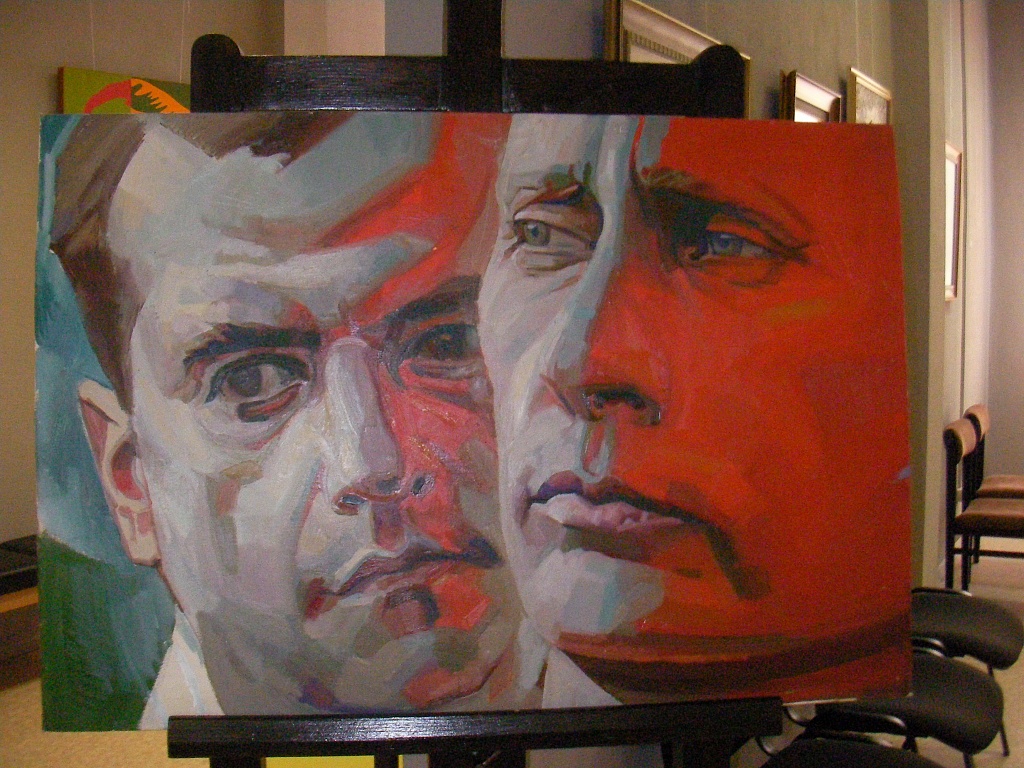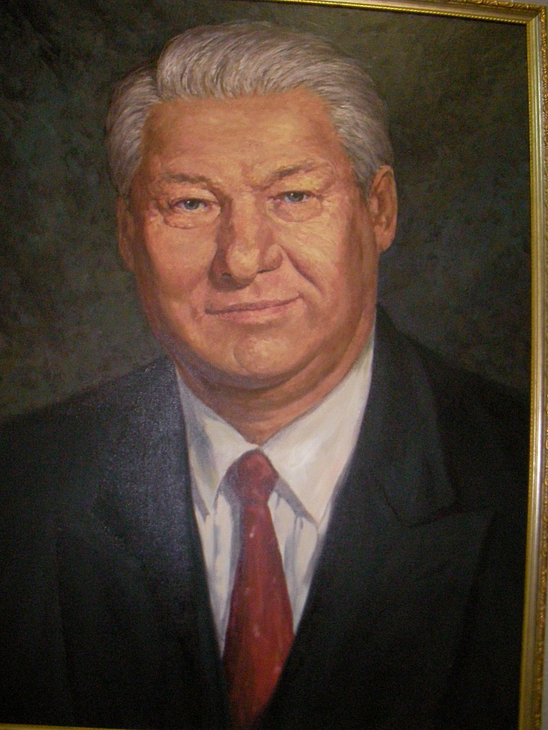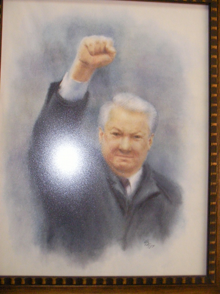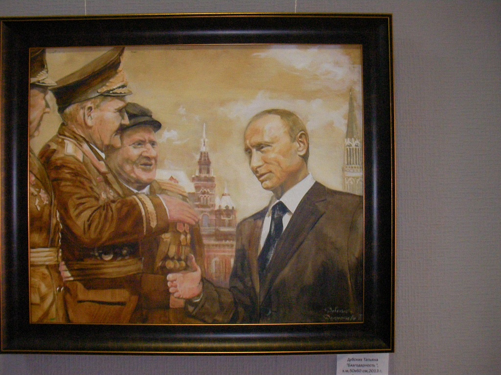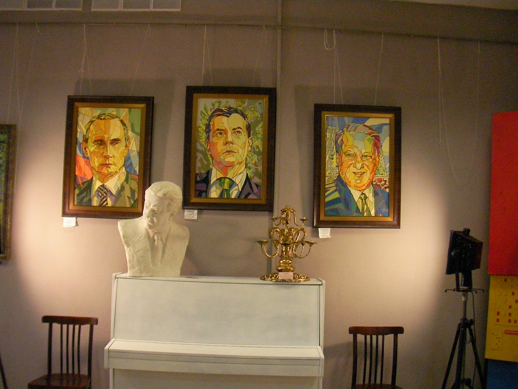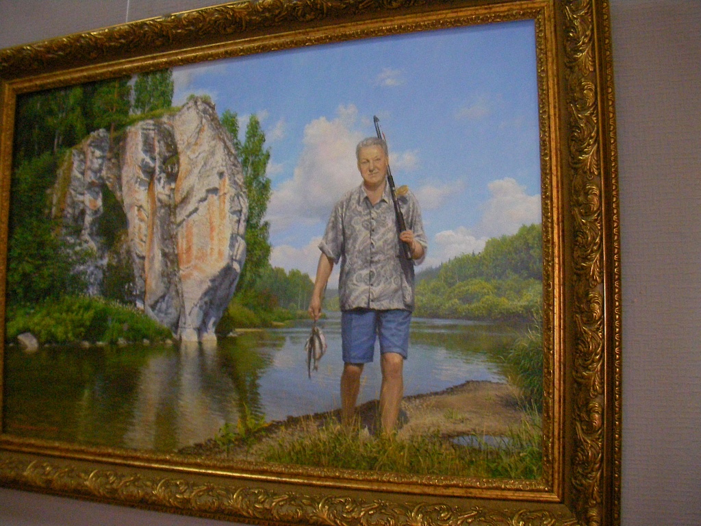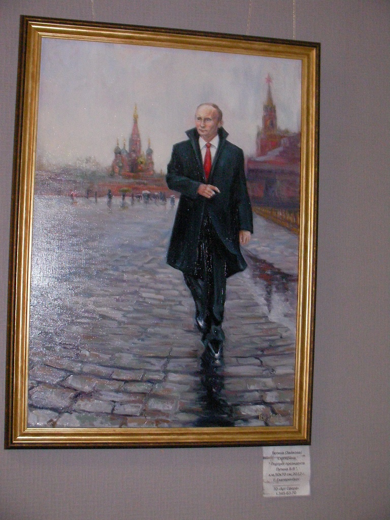 Вчера вечером в городском выставочном центре состоялось открытие очередной… даже не знаю как это назвать-то. Ну давайте назовем это выставкой. Группа художников именующих себя как творческое объединение «Арт Сфера» представили на суд первоуральцев свои работы на которых запечатлены три президента России: Ельцин, Путин, Медведев и президент Чечни – Кадыров. Всем настоятельно рекомендую НЕ ХОДИТЬ на выставку. Искусства вы там не увидите. Истории тоже не встретите. А вот искусного шельмования нашей новейшей истории на выставке представлено сколько угодно. Вот, например, как вам такое видение художником нынешнего президента страны? Не спорю, относиться к нынешнему президенту можно по разному, но… вот как вы думаете, что хотел этой работой сказать художник? В том-то и дело, что он сам вряд ли знает ответ на этот вопрос. И так с большинством работ представленных на выставке. Наиболее показательна в этом смысле вот эта картина художника Владимира Братецкого. Этот специалист области рисования кистью и красками несколько лет назад обнаружил как ему показалось золотую жилу. Брал фотографии известных политиков и… перерисовывал. Изображал первых лиц области и страны то на рыбалке, то за столом с персиками. При этом тешил себя надеждой, что работу эти обязательно будут куплены, причем непосредственно теми ко на них изображен. Однако этого е произошло. Тот же бывший губернатор Свердловской области Александр Мишарин отказался приобретать портрет себя самого с трехкилограммовой щукой в одной руке и удочкой в другой.