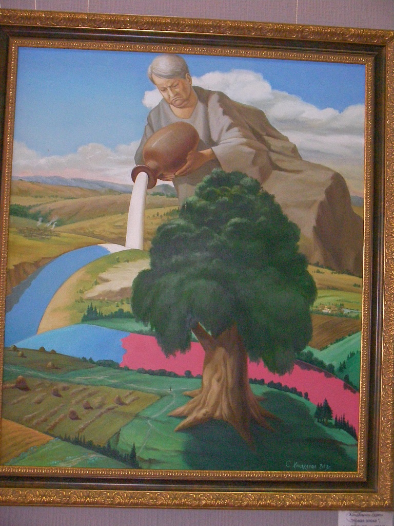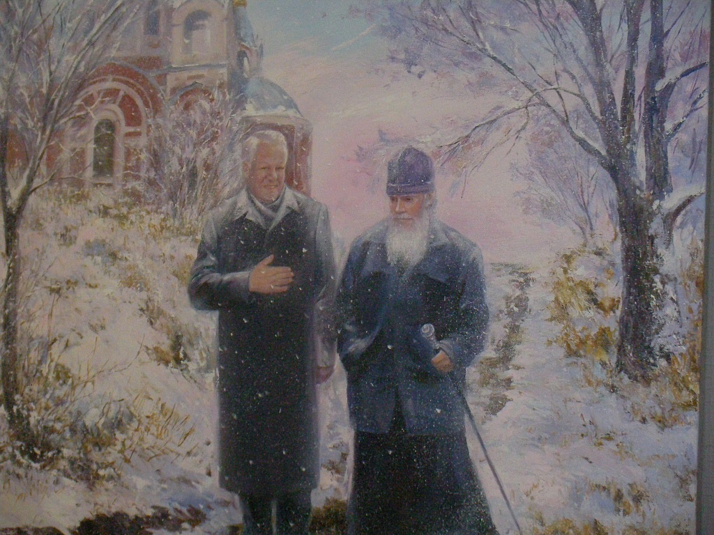 Однако венцом творческой деятельности Владимира Братецкого следует считать вот это полотно. Дело в том, что существует еще одна точно такая же картина того же автора. Разница между этими двумя полотнами заключается в том, что тут Путин с Кадыровым беседуют на фоне Кремля, на другой картине тот же самый разговор идет на фоне отстроенного после войны Грозного. В общем дело у художников из творческого объединения поставлено на поток. Перерисовываем известный портрет, приляпываем к телу голову какого-нибудь президента, называем это искусством. Материалы по теме: