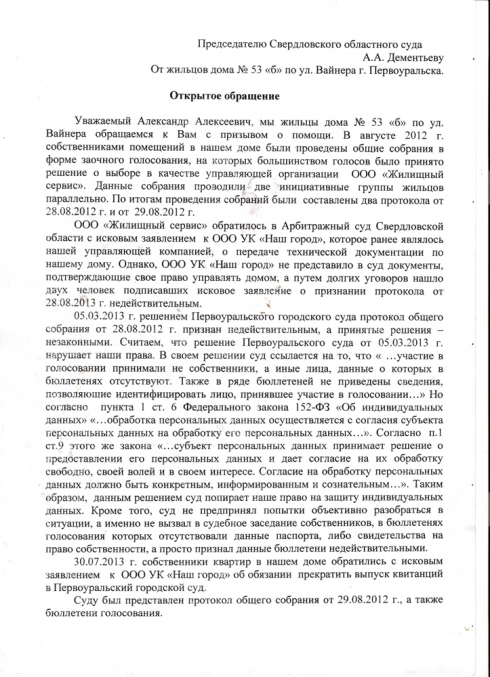 Жители нескольких десятков квартир дома 53 по улице Вайнера в Первоуральске подписались под обращением к председателю Свердловского областного суда Александру Дементьеву. Они жалуются на управляющую компанию «Наш город», которая уже больше года продолжает требовать от них деньги за услуги ЖКХ, несмотря на прекращение договора.