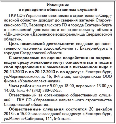«Наш основной источник питьевой воды – Волчихинское водохранилище. Если что-то случится – упадет состав с нефтью, метеорит, самолет, или придет парень и разобьет пробирку с бактериями, что вы будете делать? В этой ситуации каждому из вас станет уже не до сапсана с хариусом», – заявил представитель «Водоканала». Отметим, что строительство Шишимского водохранилища займет 5 лет, Дарьинского – 6, еще от 2 до 4 лет водоемы будут наполняться и только после этого могут быть сданы в эксплуатацию. Защитники парка «Река Чусовая» намерены на этапе разработки предпроектной документации все же добиться сохранения границ ООПТ. Отметим, что свои предложения общественники могут направлять до 31 декабря 2013 г.