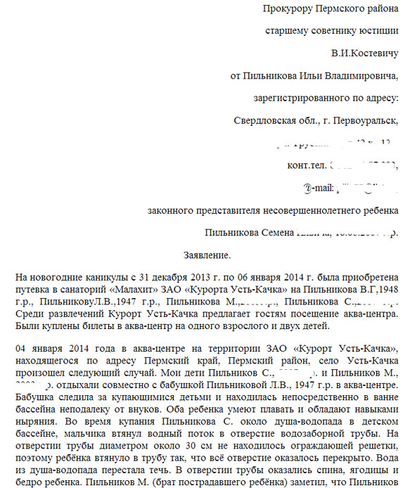 Родители 6-летнего первоуральца Семена Пильникова, в новогодние каникулы едва не погибшего в аквапарке известного в Пермском крае курорта Усть-Качка, обратились в прокуратуру этого региона с просьбой возбудить уголовное дело в отношении организаторов опасного аттракциона. Об этом Znak.com рассказала мама пострадавшего мальчика Елена Пильникова.