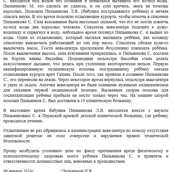 По ее словам, до сих пор никто из представителей аквацентра не принес своих извинений семье за произошедшее. Не возымели успеха и самостоятельные попытки родителей ребенка связаться с собственниками этого заведения, чтобы каким-то образом прояснить ситуацию. Вместе с бабушкой, дедушкой и старшим 10-летним братом Михаилом Семен приехал в санаторий «Малахит» в Усть-Качке из родного Первоуральска отдохнуть в новогодние праздники. « У нас с мужем недавно родился третий ребенок, поэтому поехать со старшими мы не смогли. Вызвалась бабушка»,— уточнила Елена Пильникова. 3 января семья посетила местный аквацентр в первый раз и на следующий день, 4 января, отправилась туда снова. В какой-то момент бабушка отправилась на «берег» отдохнуть, а внуки решили сплавать к каскадному душу. Собственно в этот момент и произошло ЧП. «Миша уплыл чуть вперед, а когда обернулся, Семена уже не было на поверхности воды»,— рассказала Елена Пильникова. Мальчик догадался нырнуть под воду и увидел там страшную картину — брата наполовину засосало в водоприемную трубу. Сначала мальчик попытался высвободить Семена сам — не получилось. Подбежавшей бабушке тоже этого не удалось сделать, равно как и другим отдыхавшим, поспешившим на помощь. Спасатель аквапарка также не смог ничего поделать. В итоге, когда через несколько минут отключили насосы, Семена достали уже посиневшим и бездыханным. «Местная медсестра пыталась сделать ему искусственное дыхание, хотя сначала надо было слить воду из легких. Хорошо, что там же отдыхал другой врач. Она сумела привести Семена в чувство»,— продолжила мама ребенка. Первыми словами вернувшегося практически с того света Пильникова-младшего были: «Я сейчас умру». На скорой помощи его доставили в пермскую краевую детскую больницу и только буквально на днях он начал вставать с постели и то только на одну ногу. Бедро второй, попавшее в водосток, до сих пор болит. Что будет с мальчиком дальше, врачи пока не зарекаются. «Кто-то говорит, что легкие серьезно пострадали и теперь будут постоянные пневмонии. Другие говорят, что все обойдется — дети восстанавливаются быстрее взрослых»,— говорит Елена Пильникова. Психологическое состояние ребенка тоже пока оставляет желать лучшего — Семен уверен, что пережил смерть и сильно переживает. Будучи в больнице, он принялся пытать старшего брата: «Тебе жалко было меня, когда я умер?». Как быть с этими последствием произошедшего родители пока не знают. Вчера к ребенку в больницу приезжала главврач санатория «Малахит», где отдыхали Пильниковы. А вот представители аквапарка пытаются, похоже, сделать все, чтобы выгородить себя. «На место ездили следователи (сотрудники пермского управления Следственного комитета РФ). Им рассказывали, что водозабор, в который засосало мальчика, был оборудован решеткой. Хотя все, кто там был, в голос говорят, что в момент ЧП ее там не было»,— уверяет Пильникова. Вместе с мужем женщина намерена добиваться объективного расследования произошедшего.