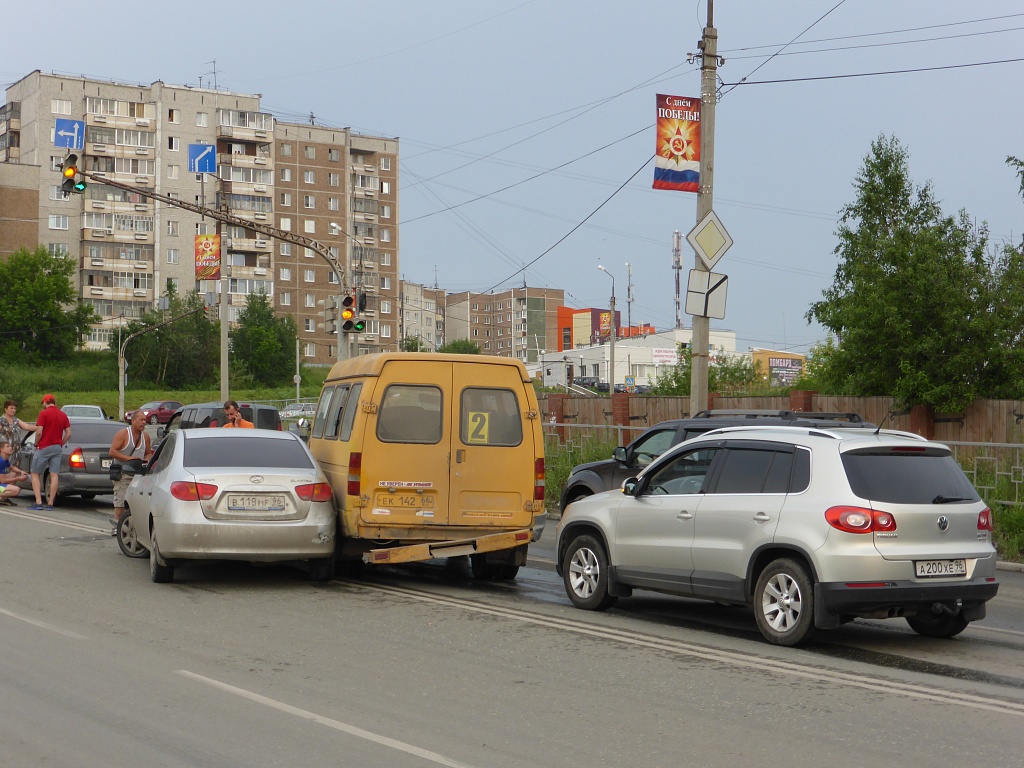Сегодня в Первоуральске на ул. Ленина, 65, напротив "Дома - музея", произошло ДТП с участием четырех автомобилей. Со слов очевидцев, автомобиль "Hyundai Elantra" двигался со стороны рынка в направлении старотрубного завода. В повороте, не справившись с управлением, автомобиль задел двигавшийся по встречной полосе во встречном направление "Hyundai Accent" и в лоб лоб врезался в пассажирскую "Газель", после чего пристроился сбоку от маршрутки и остановился. А напоследок, не успев остановиться, во все это дело легонько въехал "Volkswagen Tiguan". Елантра и Газель оказались сильно повреждены, и вряд ли сами смогут передвигаться. В Елантре сработали подушки безопасности, другие два участника ДТП отделались царапинами. Также со слов очевидцев, известно, что пилот Hyundai Elantra, по внешним признакам, находился в трезвом состоянии, а вот куда он так летел не известно. фото: первоуральск.рф Материалы по теме: