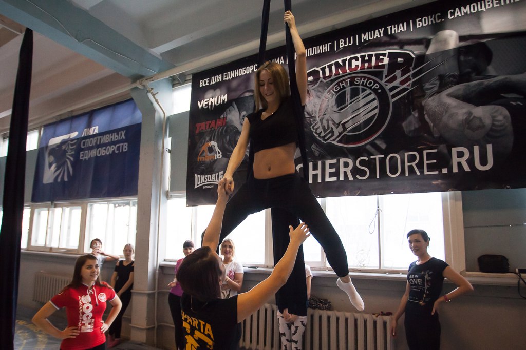 В воскресенье, 20 ноября, организация «Первоуральск — город чемпионов» совместно со школой смешанных единоборств «Спарта» провела мастер-класс по воздушной гимнастике и тренировку по самообороне для участниц конкурса «Уральская невеста». 16 участниц конкурса «Уральская невеста» поменяли на один день туфли на удобные кроссовки, в школе «Спарта» девушек ожидало две тренировки. Разгоревшись, девушки принялись овладевать искусством воздушной гимнастике на полотнах. Конкурсантки выполнили несколько акробатических элементов на высоте, объединяющих в себе гимнастику и танец. «Мы показали девочкам базовые элементы нашего вида спорта. Но девочки – молодцы, они со всем справились уже на первом занятии. Регулярные занятия воздушной гимнастикой очень полезны: подтягиваются мышцы, появляется растяжка, качается пресс, руки становятся сильными», — говорит тренер по воздушной гимнастике Алиса Свиридова. Сейчас у девушек проходит последняя неделя подготовки. За месяц, что идет конкурс, участницы попробовали себя в роли фотомоделей, научились дефилировать и танцевать. Посещение мастер-класса — является одним из этапов подготовки к финальному шоу. «Спорт закаляют характер, у многих наших конкурсанток появляется интерес к спорту после конкурса, они потом приходят, занимаются. Когда мы сказали, что идем на мастер-класс от «Города чемпионов», девушки сначала не знали, что их ждет, боялись, что это будет сдача норм ГТО. Но когда они узнали, что это мастер-класс по обороне и воздушной гимнастике, они обрадовались», — говорит организатор конкурса «Уральская невеста» Татьяна Кирьякова. Кроме того, для участниц конкурса красоты прошла тренировка по женской самообороне, где в качестве спарринг-партнеров были их женихи и мужья. Наставниками выступили мастер спорта по греко-римской борьбе Александр Шмаков и тренер по тхэквондо Андрей Байсалбаев. «Боевыми искусствами должны обладать все девушки, даже те, которых есть кому защитить. Участницы конкурса усвоили азы того, как нужно действовать в ситуации нападения. У многих получалось не с первого раза, тем более в роли «злодеев» выступали их родные мужья. Но в итоге тренировка получилась очень продуктивной. Хотя я надеюсь, что таких ситуаций, когда девушкам придется применять полученные навыки, не произойдет», — говорит Александр Шмаков. Супруги Мосиенко вместе пришли на тренировку и признают, что узнали много нового и полезного. «Девушка должна заниматься спортом, что быть красивой и стройной. Поэтому на тренировку пришла с удовольствием и получила заряд положительных эмоций», — говорит Дария Мосиенко. «Девушки должны заниматься спортом, вести здоровый образ жизни, чтобы фигура была подтянутая и настроение всегда хорошее. Конечно, девушке важно знать приемы самообороны, для того, чтобы была внутренняя уверенность, что она сможет за себя постоять», — сказал Максим Мосиенко. Проводить тренировку для участниц конкурсов красоты стало доброй традицией для организации «Первоуральск – город чемпионов». «Мы стараемся вовлекать в спорт и детей, и взрослых, и девушек, и мужчин. Наша организация готова поддержать всех, кто хочет заниматься спортом. Организаторы конкурса красоты вышли с такой инициативой, и мы с удовольствием ее поддержали. Думаю, для девушек будут полезны обе тренировки, по возду