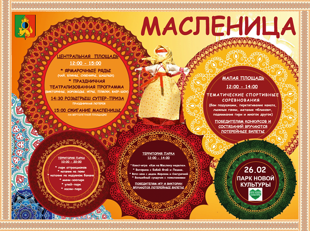 Приглашаем Вас на городскую праздничную программу «Широкая масленица», которая пройдет в парке новой культуры. Провожать зиму и встречать весну помогут: студия «Три апельсина», муниципальный театр драмы «Вариант», Централизованная клубная и библиотечная системы, учреждение спорта «Старт», а также шоу-группа «Юла». По старой доброй традиции гости народных гуляний смогут приобрести для себя «масленки» и загадать заветное желание, которое обязательно исполнится. В течение праздника на всех площадках, где будут организованы игры, конкурсы и соревнования жители получат купоны, по которым будет проведен розыгрыш подарков, а также будет разыгран главный супер-приз. А в 14-30 на главной площадке состоится розыгрыш супер приза! В центральной зоне Парка Вас ждут: игровые программы, хороводы, народные гуляния, квест-игры и Фаер-шоу. На малой площадке (в зоне ледового катка) будут организованы спортивные состязания. Также в течение всего дня для вас будет работать Парк аттракционов «Жемчужина», мини-зоопарк, Улей-парк, Хаски-парк, организована фото зона для детей и взрослых, катание на пони и на надувном банане. На ярмарке приготовлено главное угощение дня – блины! Основная часть праздника завершится традиционным обрядом сожжения чучела Масленицы в 15-00 (на вертолётной площадке). Материалы по теме: