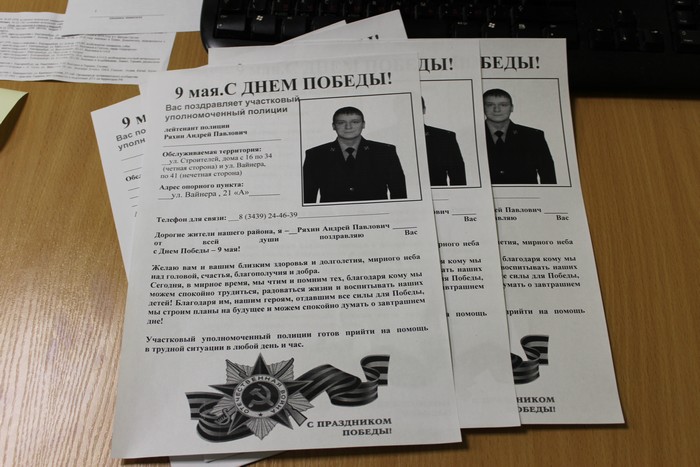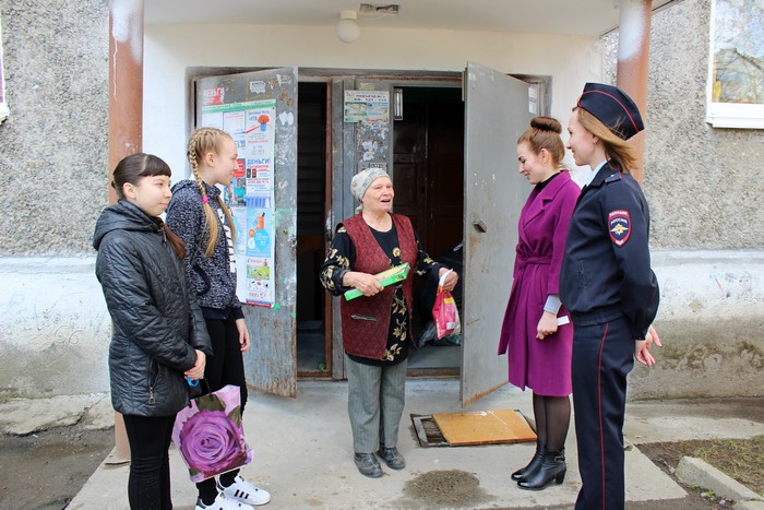 Представители самых разных подразделений Первоуральского отдела МВД приняли участие во всероссийской акции «Я помню, я горжусь. Служу России!», сообщает пресс-служба ОМВД России по г. Первоуральску. Так, в преддверии Дня Победы в Великой Отечественной Войне сотрудники ГИБДД Первоуральска совместно с учениками и педагогами городских школ, ЮИДовцами, членами Общественного Совета и городской добровольной народной дружины посетили по месту жительства трёх участников Великой Отечественной войны: Марию Максимовну Калишенко, Марию Александровну Канчер и Таисию Алексеевну Князеву. Гости выразили огромную благодарность за Великую Победу этим замечательным женщинам, пережившим страшные годы противостояния вражескому нашествию и давшим возможность спокойно трудиться и радоваться жизни нынешнему поколению. Пожелав крепкого здоровья и благополучия, участники встречи вручили открытки и подарки ветеранам. Представители службы участковых уполномоченных полиции также внесли свой вклад в благое дело, присоединившись ко всероссийской акции МВД России. На обслуживаемой территории стражи порядка ежедневно вручают листовки населению, где помимо поздравительного адреса содержатся все необходимые контакты и фото самих участковых. Такие листовки полицейские размещают в опорных пунктах полиции, на информационных стендах в общественных местах, а также на подъездах жилых домов, расположенных на вверенной территории. В эти майские дни приятные и полезные листовки участковые вручают каждому посетителю во время приема граждан на опорных пунктах. «Подобные мероприятия помогают в очередной раз напомнить населению о нашем желании и готовности помогать людям в самых непростых жизненных ситуациях и очень приятно видеть положительные эмоции и ответные поздравления благодарных граждан», - отметил начальник службы участковых уполномоченных полиции ОМВД России по городу Первоуральску подполковник полиции Сергей Микрюков. Руководство и личный состав Отдела МВД России по городу Первоуральску поздравляет всех жителей с очередной, 72-ой годовщиной Победы в Великой Отечественной войне и желает всем мирного неба над головой, крепкого здоровья, благополучия и долголетия!