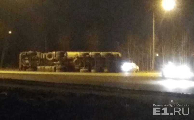 Рядом с завалившимся грузовиком стояла машина ДПС с проблесковыми маячками, но скорых рядом не было. Проблем с движением лежащая машина не создала, так как в это время суток там проезжает не очень большой поток машин.