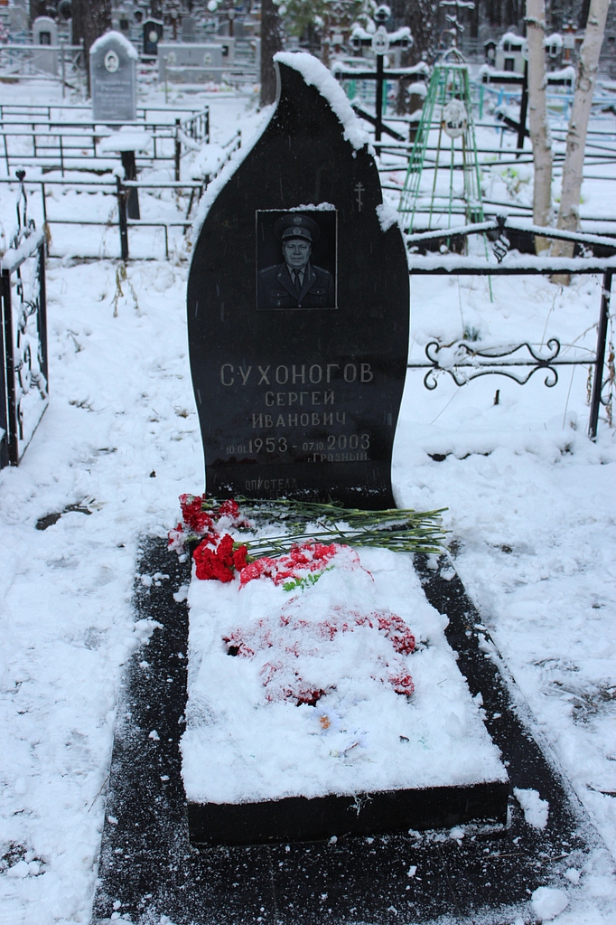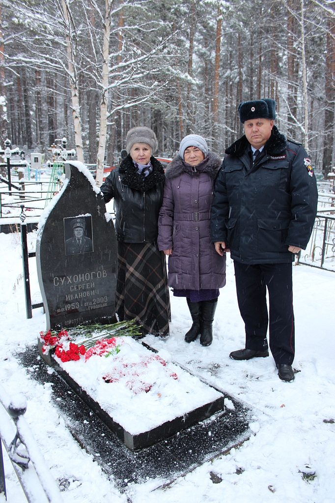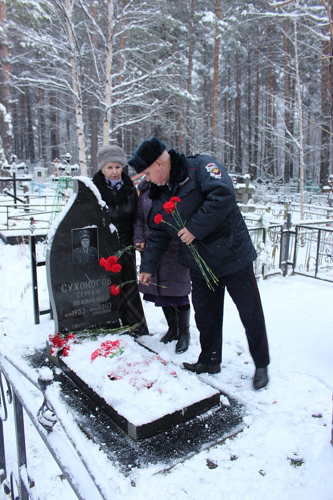 В канун профессионального праздника сотрудники и ветераны Первоуральского отдела МВД почтили память коллеги — подполковника милиции Сергея Сухоногова, 15 лет назад погибшего во время служебной командировки в городе Грозном от огнестрельного ранения в голову. 7 октября 2003 года в 21.25 минут в дежурную часть УВД МВД России по Чеченской Республике поступило сообщение о том, что в 17 часов 40 минут напротив дома № 119 по улице Жуковского города Грозный неустановленные лица, передвигавшиеся на автомашине ВАЗ-2106 белого цвета, обстреляли из автоматического оружия машину ВАЗ-2105, в которой находились начальник отделения по обеспечению безопасности подполковник милиции Сергей Сухоногов со своим коллегой. В результате обстрела Сергей Сухоногов получил множественные огнестрельные проникающие ранения головы и скончался на месте, с почестями похоронен на кладбище Первоуральска. Ежегодно в памятные даты коллеги и друзья посещают могилу Сергея Ивановича, возлагают живые цветы и вспоминают совместные годы службы. Вдова милиционера Алевтина Александровна всегда с радостью приветствует товарищей своего погибшего мужа, двери ее дома всегда открыты для коллег Сергея Ивановича. Руководство и Совет ветеранов Первоуральского отдела МВД ежегодно вручают цветы и подарки этой замечательной женщине, пережившей страшную трагедию в своей жизни. «Прошло 15 лет, а в памяти все события сохранились настолько отчетливо, как будто это было вчера. Спасибо всем за поддержку и теплое отношение к светлой памяти моего супруга», - отметила Алевтина Александровна. Сухоногов Сергей Иванович родился 10.01.1953 года в деревне Першино Вагайского района Тюменской области. После окончания Дубровинского СПТУ – 10, до службы в армии работал в совхозе «Черноковский» трактористом. После службы в рядах Советской Армии Сергей Иванович приезжает в г. Первоуральск, где продолжает трудовую деятельность на Новотрубном заводе в качестве стропальщика. В ноябре 1976 года приходит на службу в Первоуральский ОВД рядовым милиционером. За период службы прошел длинный путь становления в милиции и служил на должностях: милиционера, инспектора по организации дорожного движения, участкового инспектора, старшего участкового инспектора, начальника ИВС, заместителя начальника милиции общественной безопасности. В 1999 году Сергей Иванович назначен на должность начальника отделения обеспечения общественного порядка. За время службы получил среднее специальное образование, в 1989 году окончил заочное отделения филиала Академии МВД СССР. В 1980 году, как наиболее подготовленный сотрудник, направлен в г. Москву для обеспечения общественного порядка в период проведения Олимпийских игр. В 1981 г. принимал участие в охране общественного порядка при проведении 26 съезда КПСС. В марте 2003 года Сухоногов С.И. по личной просьбе откомандирован в распоряжение УВД МВД России по Чеченской Республике, где проходил службу по контракту с целью обеспечения безопасности граждан административных районов и населенных пунктов отдела охраны общественного порядка МОБ МВД Чеченской Республик. В октябре 2003 года Сергей Иванович трагически погиб. Подполковник милиции Сухоногов Сергей Иванович за добросовестное исполнение служебного долга награжден медалями «За безупречную службу» трех степеней. Фотография Серге