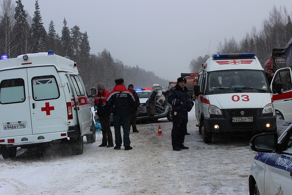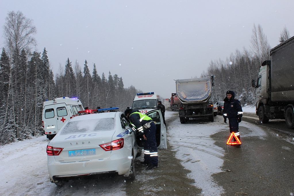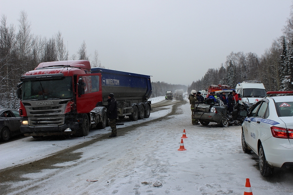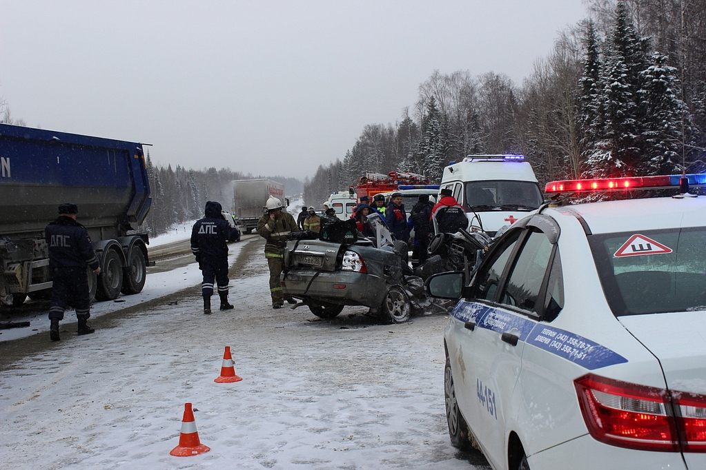 В результате сильного удара в „Приоре“ пострадали три человека — два молодых человека и девушка. Еще один 20-летний парень погиб на месте. Автомобиль не подлежит восстановлению. Чтобы извлечь потерпевших из салона машины, специалистам МЧС пришлось применить спецсредства и вырезать крышу. Раненые, в том числе водитель, на скорой доставлены в городскую больницу Первоуральска, где им оказывается необходимая помощь. В автомобиле находились студенты вузов Екатеринбурга — в частности, УрФУ и УрГПУ. По роковому стечению обстоятельств, они ехали в Ачит на похороны своей одноклассницы, погибшей в ДТП. Водителю грузовика госпитализация не потребовалась. На место происшествия незамедлительно было направлено несколько нарядов ДПС. Их возглавил врио начальника ГИБДД территориального ОВД майор Дмитрий Бердюгин, а также специалисты МЧС. В районе аварии скопилось большая пробка. Инспекторы ДПС пропускают по 10–20 машин, чтобы уменьшить пробку и снизить стоянку водителей.