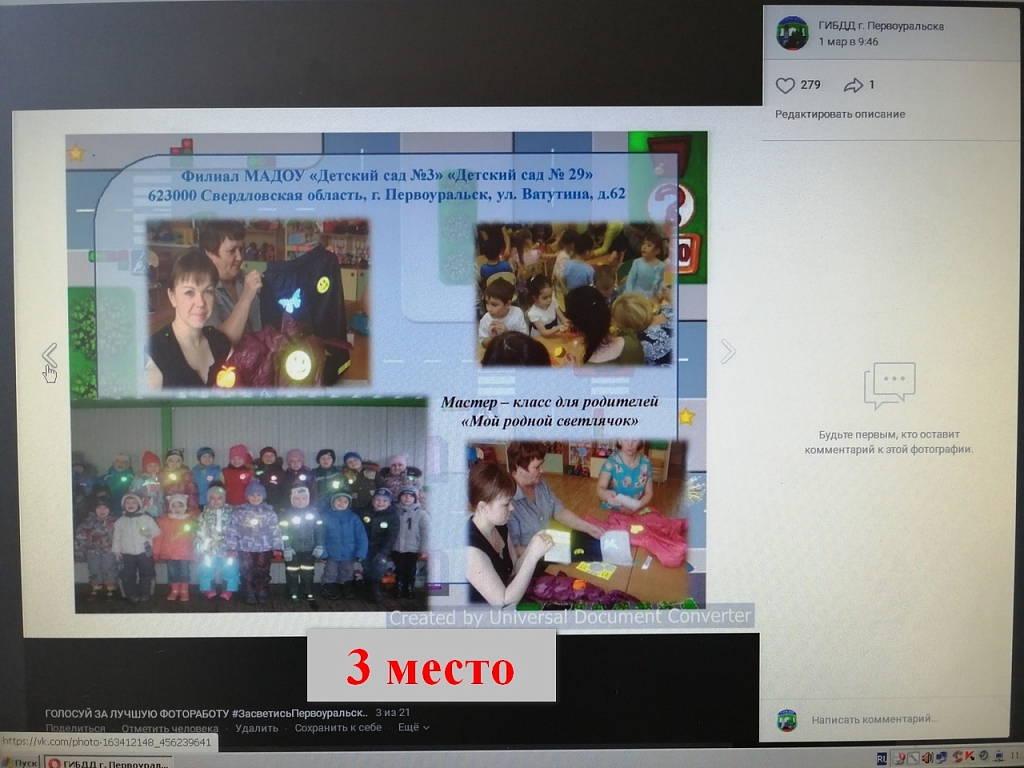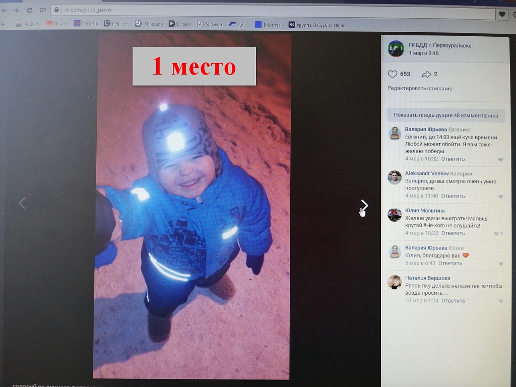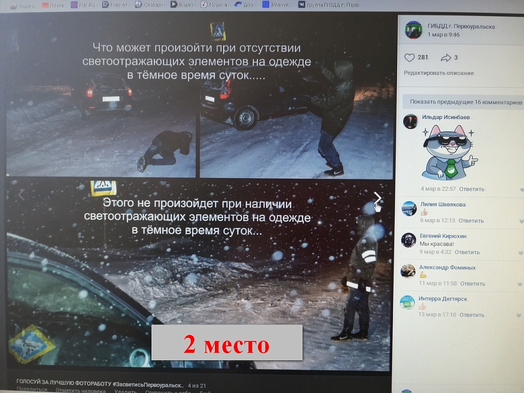Конкурс проводился в целях популяризации использования световозвращающих аксессуаров и элементов участниками дорожного движения, сообщает отдел пропаганды безопасности дорожного движения ГИБДД Первоуральска. Для участия в фотоконкурсе любой желающий без возрастных ограничений мог сделать фотографию себя либо детей, своих друзей, близких, животных, детской коляски и т.д. со световозвращающими элементами, загрузить качественное изображение в альбом группы ГИБДД Первоуральска в сети «Вконтакте» с хештегом #ЗасветисьПервоуральск https://vk.com/album-163412148_252278087 Организаторами конкурса определены авторы трёх лучших фоторабот, набравших наибольшее количество лайков: 1 место с 653 лайками заняла фоторабота Валерии Юрьевой 2 место с 281 лайком заняла фоторабота Натальи Цветковой 3 место с 279 лайками заняла фоторабота ДОУ № 29 Ирины Танкаевой Кроме того, в номинации «За креативность» определена фоторабота Ирины Соколовой. Организаторами конкурса принято решение о поощрении дополнительным призом фотоработу Владислава Уральского. Награждение победителей пройдёт 20 марта в 16:00 в отделении ГИБДД по адресу 3-ий км Московского шоссе, д.3а, 3 этаж.