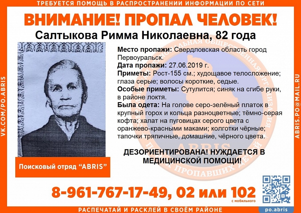 В Первоуральске ищут 82-летнюю пенсионерку, которая рано утром 27 июня ушла из городской больницы и пропала без вести. Зовут ее Салтыкова Римма Николаевна. По словам волонтеров поискового отряда «Прорыв», у бабушки есть проблемы со здоровьем. Она может быть дезориентирована. Всем, кому известно местонахождение Риммы Николаевны, просьба сообщить координаторам поиска: +7 961 767 17 49 или в полицию: 02, 102.