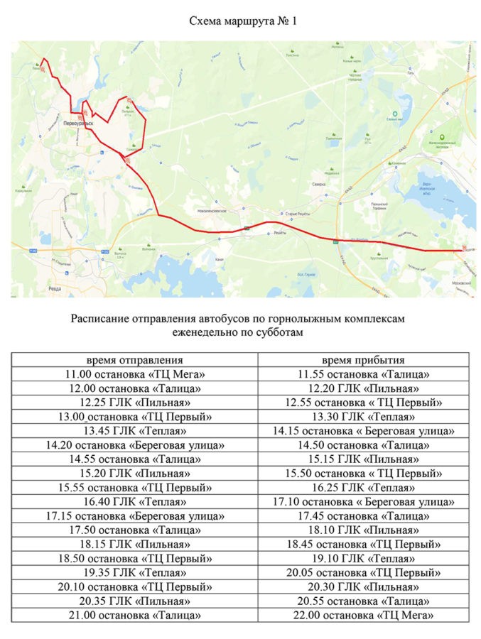 Два автобуса будут курсировать между комплексами каждую субботу в течение января, февраля и марта. Отправной и конечной точкой маршрутов будет ТЦ «Мега» на въезде в Екатеринбург (остановка автобуса №150). Однако первоуральцам нет необходимости начинать свой спортивный вояж именно оттуда. Маршрут предусматривает остановки в черте нашего города, например, «Талица», «ТЦ Первый», «Береговая улица». Отметим, маршруты автобусов пересекаются, таким образом, в один день можно посетить сразу несколько гор. Опознать автобус, курсирующий между ГЛК, можно по наклейке «Горы Первоуральска». Проезд в этих автобусах бесплатный. Публикуем расписание маршрутов. С ним также можно будет ознакомиться как в самом автобусе, так и на информационных досках, расположенных на турбазах.