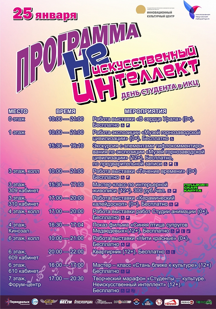 25 января в России отмечается Татьянин день. Праздник это старинный и имеет множество традиций. Например, в Первоуральске День студента принято отмечать большим творческим онлайн-марафоном и праздничной программой в Инновационном культурном центре. Весь день для гостей праздника будут работать общедоступные выставки: «В сердце Урала» (0 этаж), «Музей горнозаводской цивилизации» (1 этаж), «Течение времени» (з этаж), «Керамический калейдоскоп» (310 кабинет), выставка работ Студии анимации ИКЦ (4 этаж), «Нити красные» (6 этаж). В 15:30 в Музее горнозаводской цивилизации начнется экскурсия с элементами тифлокомментирования, участникам которой будут представлены, в том числе, и новые тактильные модели экспонатов, посвященных быту жителей Урала. В это же время стартует мастер-класс по интерьерной живописи (300 рублей. 12+. Возможна оплата «Пушкинской картой»). А в 16:00 состоится еще один мастер-класс – «Стань ближе к культуре». На нем вы узнаете о том, что такое «Пушкинская карта» и какие возможности она предоставляет. Далее, в 16:30 состоится показ документального фильма «Синяя птица супругов Медведевых», который будет сопровождаться тифлокомментарием и расширенными субтитрами. В 17:00 начнется творческий онлайн-марафон «Студенты – культуре. Неискусственный интеллект», участие в котором примут талантливые студенты из разных городов Свердловской области. Присоединиться к трансляции можно на странице ИКЦ во ВКонтакте. В 20:00 в честь своего пятилетия волонтеры культуры из «Лиги друзей ИКЦ» приглашают всех желающих на душевный концерт «Квартирник». Кстати. Любой из гостей может стать его участником не только в качестве зрителя и слушателя, но и в качестве выступающего. Материалы по теме: