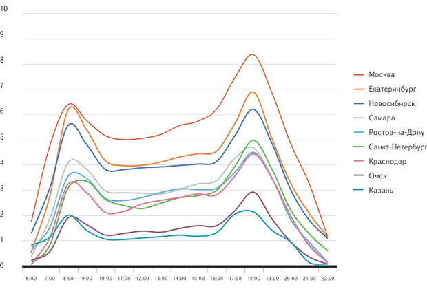 По «баллам» утренних пробок в будние дни (с 8:00 до 9:00) Екатеринбург, согласно данным за сентябрь и октябрь 2013 года, показывает такое же пиковое значение (6 баллов), как в столице. Екатеринбург также занимает второе место по общей загруженности дорог после столицы. Авторы отчета пояснили, что для сравнения загруженности дорог в различных городах они пересчитали все «баллы» пробок по Москве. В обычной ситуации, как уточнили аналитики, «балльность» по городам варьируется, «чтобы соответствовать представлениям местных автомобилистов о том, что такое загруженные или свободные дороги». В качестве примера приведена ситуация, когда увеличение времени, которое надо потратить на дорогу, в полтора раза, означает семибалльные пробки в Омске, но только четырехбалльные — в Новосибирске. Ситуация с пробками в Екатеринбурге значительно изменилась за последние несколько лет. Так, согласно отчету «Яндекс.Пробки» за 2011 год, уральский город «отставал» от Москвы в утренние часы пик почти на два балла, а в 2010 году — на полтора балла. Стоит отметить, что такие изменения могли быть вызваны в том числе получением более подробных данных о пробках в Екатеринбурге в последнее время. На третьем месте по загруженности улиц после Москвы и Екатеринбурга, по данным «Яндекс.Пробки» стоит Новосибирск. Наиболее благоприятная ситуация сложилась в Казани, где в утренний час пик пробки эквивалентны двум «московским баллам». Самыми загруженными днями для автомобилистов, как говорится в отчете, в 2013 году стали дни, когда шел дождь или снег, а также предпраздничные дни (30 апреля и 7 марта). Утренние часы пик по всей России продолжаются в среднем с 8:00 до 10:00, а вечерние — с 17:00 до 19:00. Материалы по теме:Раздел не найден. |
