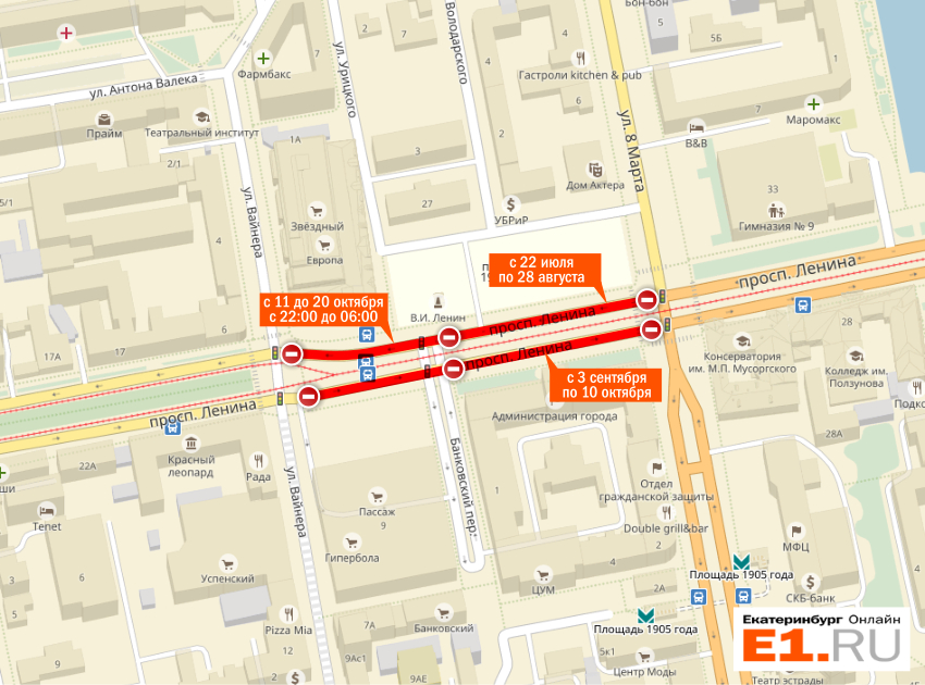 Нечётную сторону проспекта Ленина в Екатеринбурге откроют для транспорта 28 августа