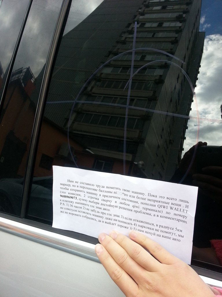 После ужесточения ответственности за хищение автомобильных регистрационных знаков, злоумышленники придумали новую схему вымогательства денег у автомобилистов. Так, в Подмосковье появились хулиганы, которые вешают на автомобили записки с угрозами повредить машину, если владелец не заплатит 999 рублей, пишет "Авторамблер". О таком случае вымогательства рассказал на интернет-портале города Долгопрудный пользователь под ником megaholod-ank. Записку с угрозами он обнаружил на стекле своего автомобиля 28 мая — неизвестные требовали перевести на счет 999 рублей, в противном случае обещали либо поцарапать машину, либо порезать колеса. Денежные средства предлагалось положить на электронный кошелек платежной системы KIWI. Автовладелец был крайне удивлен тому, что выбор вымогателей пал именно на его недорогое авто, которому 15 лет. Он также исключил вероятность того, что послание является злой шуткой соседей, поскольку машина была припаркована по правилам и никому не мешала. Он добавил, что не собирается обогащать мошенников, а обратится с заявлением в полицию. Хотя, по его словам, и не чувствует, что это как-то защитит его автомобиль. Примерно такая же история приводится в группе города Долгопрудный в соцсети "ВКонтакте". Ранее во многих российских городах и особенно в столице процветали кражи автомобильных номеров для вымогательства денег с автовладельца. По этой причине в пошлом году в УК РФ была введена статья «Неправомерное завладение государственным регистрационным знаком транспортного средства». Наказание по ней предусматривает штраф в размере до 200 тыс. рублей либо обязательные работы до 360 часов, либо исправительные работы на срок до 1 года, либо лишение свободы на тот же срок. Материалы по теме: