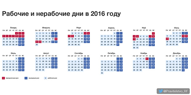 В июне агентство Regnum сообщило, что трехсторонняя комиссия по регулированию социально-трудовых отношений правительства рассмотрела вопрос о том, какие дни необходимо сделать выходными в 2016 году, и был составлен предварительный график. |