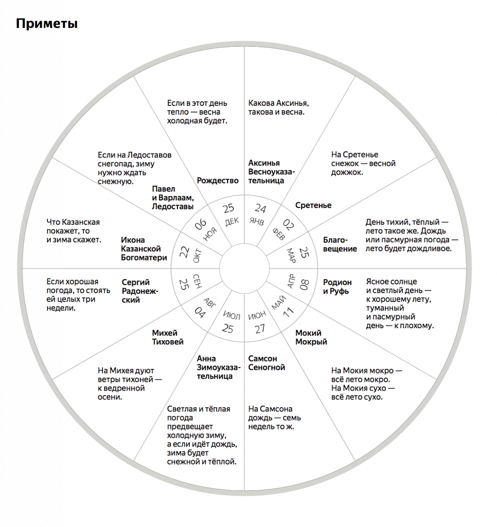 Компания «Яндекс» проанализировала погодные данные за 36 лет и выяснила, можно ли верить народным приметам, которые «предсказывают» погоду. Оказалось, практически все они не работают. Исследователи компании выбрали приметы, которые по погоде в определенный день предсказывают погоду на будущий отрезок времени. Например: «Что Казанская скажет — то и зима покажет» или «Какова Аксинья, такова и весна». Все даты, к которым относились приметы, перевели на старый стиль, так как приметы появились задолго до Григорианского календаря. Анализ проводился по четырем основным показателям: температура, облачность, количество осадков и скорость ветра. Также в компании решили проверять приметы для каждого города отдельно, так как везде погода разная. Из 188 выбранных примет лишь 75 сбывались больше чем в половине случаев. «Это значит, что большинство примет вообще лучше понимать наоборот», — иронизируют в «Яндексе». Всего шесть народных примет исследователи назвали относительно точными, так как они сбывались в 70% случаев. Тройка лидеров по точности среди примет выглядит так: