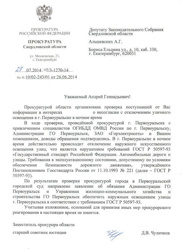 По результатам обследований областная прокуратура подтвердила, что муниципалитет нарушает требования ГОСТа 50597-93, раз отключает в час тридцать ночи уличный свет. Впереди судебные перипетии.