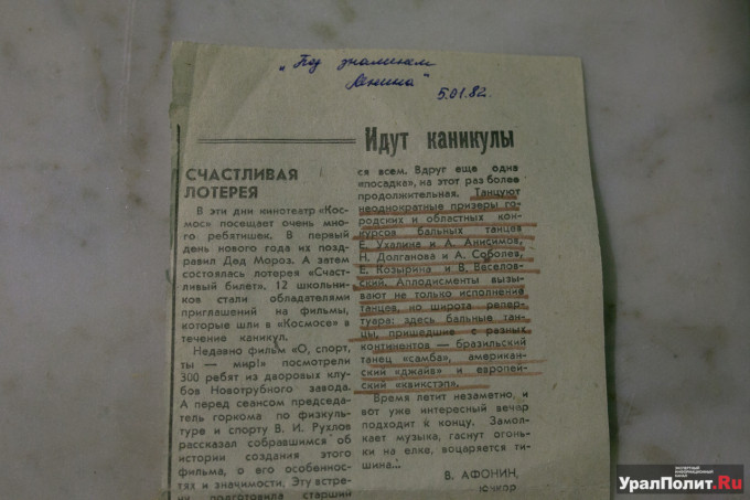 Вырезка из газеты «Под знаменем Ленина», архив школы «Интересно встретили Новый год старшеклассники школы № 32, а помогли им ученики 10 «А» класса, которые взяли организацию праздничного вечера в свои руки. <…> Вот грянул дружный призыв: «Елочка, зажгись». И веселые мохнатые ветви озаряются разноцветными огоньками. В зале раздаются первые звуки музыки, карнавал начинается. Однако фантазия десятиклассников, готовящих вечер, на этом не заканчивается. Актовый зал объявляется самолетом. За штурвалом – А. Анисимов и А. Абрамов. Стюардессы И. Дружинина и Е. Лодыгина знакомят «пассажиров» с тем, как встречают Новый года в разных странах – Индии, Иране, Вьетнаме, Кубе, Болгарии. <…> Так, чередуя «взлеты» и «посадки» продолжается «полет». Музыка нравится всем. Еще одна «посадка», на этот раз более продолжительная. Танцуют неоднократные призеры городских и областных конкурсов бальных танцев Е. Ухалина и А. Анисимов, Н. Долганова и А. Соболев, Е. Козырина и В. Веселовский. Аплодисменты вызывает не только исполнение танцев, но и широта репертуара: здесь бальные танцы, пришедшие с разных континентов – бразильская «самба», американский «джайв»и европейский «квикстеп».