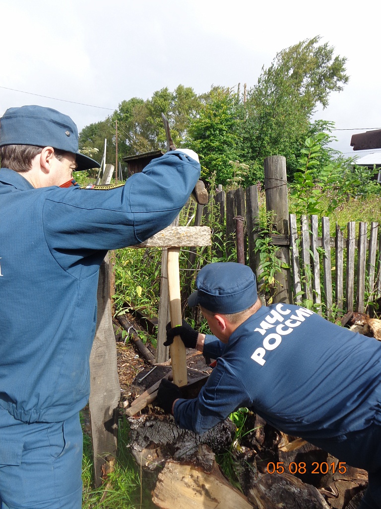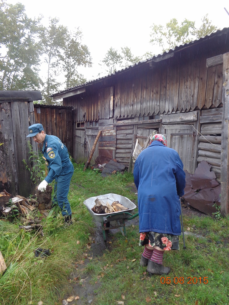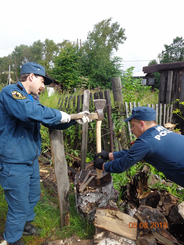 В системе МЧС проходит акция «25 добрых дел». Цель акции – организация и осуществление добрых дел. 13 августа 2015 года сотрудники ОНД ГО Первоуральск совместно с сотрудником по социальной работе ГАУ КЦСОН «Осень» приняли участие в акции, посетили нуждающихся в помощи одинокую пенсионерку-труженика тыла и оказали посильную помощь в быту. Сотрудники МЧС, вооружившись колуном и тачкой, произвели уборку территории, укрепили сарай и накололи дрова. После окончания работы отзывчивая хозяйка пригласила сотрудников на чаепитие. За столом хозяйка квартиры Галина Афанасьевна отблагодарила за выполненную непосильную для нее работу и пожелала, чтобы сотрудники МЧС всегда оставались такими трудолюбивыми и отзывчивыми, при первой возможности отзывались на необходимую помощь пожилым людям.