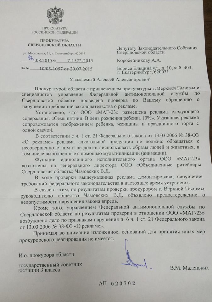 Депутат Законодательного собрания Алексей Коробейников вновь обратился в прокуратуру и Свердловское УФАС с требованием провести повторную проверку сети алкомаркетов «Семь пятниц». Напомним, ранее политик сообщал, что торговая сеть использует в своей рекламе изображение малолетней девочки, что противоречит закону. Баннеры были обнаружены в Екатеринбурге и Верхней Пышме.