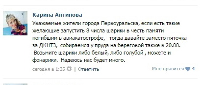 С инициативой запустить воздушные шары 8 ноября в память о жертвах авиакатастрофы выступила "вице-мисс" Новоторубного завода Карина Антипова. На своей «стене» «Вконтакте» она написала:
