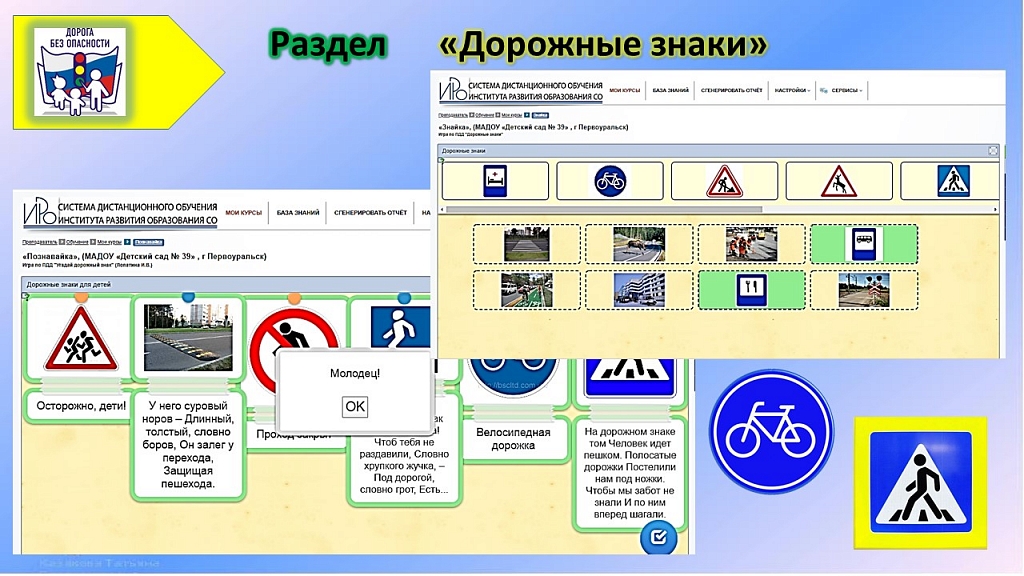 Даже в условиях самоизоляции в детском саду 39 и его филиалах, а это детские сады номер 15,20,22,25,43,95, прошла интерактивная акция "Дорога без опасности". Дети с родителями играли и повторяли правила дорожного движения. Игры, презентации подобраны в соответствии с возрастом. Например, самые маленькие повторяли правила дорожного движения со «Смешариками», детям старшей группы предлагались викторины, ребусы и уроки «Тётушки совы». В системе дистанционного обучения института развития образования поучаствовало 422 ребенка. ГИБДД г.Первоуральска |