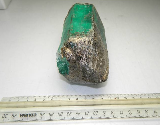 На Малышевском месторождении найден изумруд весом 1 килограмм. Камень представляет собой исключительно красивый штуф изумруда. Имя уникальному гиганту еще не придумали, а оценкой его стоимости займутся специалисты Гохрана.