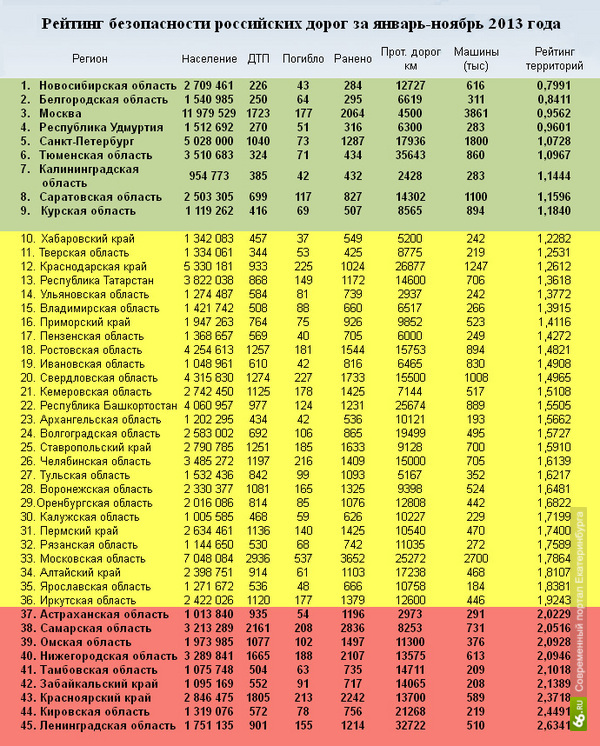 Межрегиональный центр «За безопасность российских дорог» подготовил опасных трасс страны. Казалось бы, по качеству дорожного полотна Свердловская область должна оказаться в лидерах, однако из 45 мест нашему региону эксперты присудили 20-е. Область попала в желтую зону, где антирейтинг дорог не превышает показателя 2,0 (у лидеров антирейтинга он выше). В эту группу попали регионы с недостаточной безопасностью. По подсчетам экспертов, с января по ноябрь 2013 года на территории Свердловской области произошло 1274 дорожных аварии, в которых погибли 227 человек и еще 1733 получили травмы. Главные причины роста аварийности — недостатки дорожной сети и двухполосность федеральных трасс, что провоцирует водителей на опасные обгоны, часто заканчивающиеся ДТП с тяжкими последствиями, особенно в гололед. Впрочем, эксперты не считают убогие дороги единственными виновниками смертельных ДТП. «Поведение российских водителей настолько неадекватно, что часто самым аварийным местом становится вполне приличная дорога», — заявляет руководитель центра Дмитрий Леонтьев.Самым безопасным дорожное движение оказалось в Новосибирской области (зеленая зона), наиболее опасными уже не в первый раз признаны дороги Ленинградской области (красная зона). |