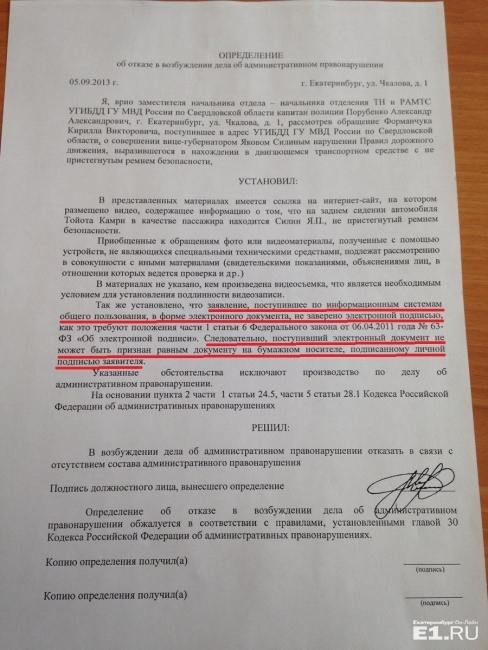 Решение судьи Ленинского суда Екатеринбурга Ольги Савиновой было вынесено в отношении заявления от председателя Комитета по защите прав автолюбителей Кирилла "Медведа" Форманчука, которое он подал на Якова Силина через сайт госавтоинспекции. Правозащитник предоставил суду свидетельские показания и документы, подтверждающие тот факт, что Силин нарушил правила ПДД и ехал в машине, не пристегнувшись ремнём безопасности. По словам Форманчука, представители ГИБДД написали, что раз заявление подано через сайт ГИБДД России, значит, оно не может быть признано равнозначным заявлению, поданному лично гражданином. – К нам часто обращаются через сайт граждане с различными заявлениями, прикладывают видео и фотографии, но не всегда удаётся привлечь к ответственности нарушителей из-за того, что не соблюдены все необходимые для этого условия, – пояснили в пресс-службе ГИБДД. – Согласно федеральному законодательству, электронная подпись должна быть. В любом случае, документ с электронной подписью не может быть признан равным подписанному вручную. А если подписи нет, то в возбуждении уголовного дела суд имеет право отказать, так как не соблюдены нормы оформления документов. В пресс-службе также объяснили, что исключений в этой ситуации быть не может, так как ГИБДД – это государственная структура и не может делать что-то в обход законодательства. – Зачем тогда выкладывать форму на сайт, если без подписи нельзя подать заявление? – прокомментировал ситуацию Форманчук. – Фигня всё это. Раньше все заявления, даже резонансные, спокойно принимали. Просто тут ситуация с Яковом Силиным, вот и отказали. Нашли причину. Известный екатеринбургский блогер Иван Соломин, известный как tramEKB, также поделился своим опытом подачи заявлений на нарушителей ПДД. – Я неоднократно и самостоятельно, и через сайт подавал заявления в ГИБДД. Все нормально, спокойно принимали без электронных подписей, и никаких проблем не было, – сказал Соломин. Проверить работу формы на портале ГИБДД у редакции E1.RU пока не получилось: сайт госавтоинспекции временно не работает. Корреспондент портала уточнил в ГИБДД, какие документы и в какой форме нужно подготовить, чтобы заявление было принято госавтоинспекцией и передано в работу: Памятка от ГИБДД "Как подавать электронное заявление" – Заявление с детальным описанием правонарушения; – Подписанное фото/видео, на котором зафиксировано событие, с точными датами и указанием места; – Свидетельские показания; – Координаты заявителя (адрес, телефон); – Электронная подпись; – Кроме того, заявитель должен быть готов явиться в органы ГИБДД для дачи объяснений, а также прийти, вслучае необходимости, в суд для дачи показаний, – пояснили в ГИБДД. Напомним, что недавно Министерство внутренних дел России презентовало собственное мобильное приложение, которое позволит пользователям смартфонов в два клика связаться с полицией и даже с телефона отправлять заявления в полицию. – Заявление нужно подавать через сайт ГИБДД от своего имени, указывая действующие контакты и почтовый адрес, – поясняет процесс подачи заявления Дмитрий Ларионов, председатель Комитета по защите прав автомобилистов. – В тексте нужно описать события: где, когда и как вы двигались, что увидели. Нужно исходить из того, что фото и видео на самом деле не будут прилож