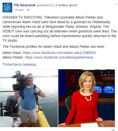 Журналистов расстреляли в прямом эфире в США В США в результате стрельбы в округе Бедфорд, штат Вирджиния, погибли двое журналистов телеканала WDBJ7. Это произошло во время прямой трансляции, когда съемочная группа брала интервью. Жертвами неизвестного преступника стали репортер Элисон Паркер (24 года) и оператор Адам Уорд (27 лет). Всё произошло в 6:45 утра по местному времени. На место инцидента прибыли сотрудники полиции,однако задержать стрелявшего по горячим следам не удалось. Известно лишь, что убийцей является мужчина, однако его мотивы не приводятся. По словам генерального директора Джеффа Маркса, во время телевизионной трансляции они услышали крики. "Мы услышали крики, а после уже ничего слышно не было", — рассказал он телекомпании CBS, чьей дочерней структурой является WDBJ7. В свою очередь, телезрители услышали крики и фразу "О господи!". В этот момент Паркер пыталась убежать, после чего трансляция прервалась, и на экране появилась взволнованная ведущая в студии. "Я не знаю, что там происходит. Мы, конечно же, сообщим вам, как только узнаем, что это были за звуки", — сказала она. Как уточняет LifeNews, нападение на журналистов произошло во время интервью для сегмента программы у "Бриджуотер Плаза". При этом героиня сюжета также пострадала в результате стрельбы.