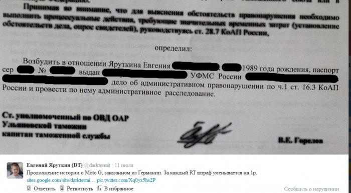 Покупка смартфона Motorola Moto G в немецком онлайн-магазине обернулась для него административным делом. Такой гаджет не продается на территории России, поэтому формально покупатель нарушил закон. Посылка через Калининград попала в Москву, а потом в местное почтовое отделение, но Яруткину телефон не отдали. "Они сказали, что он пришел с таможенным уведомлением и мне отдать его не могут. Таможенники сказали, что выдать они его не могут, потому как на данную модель телефона отсутствует нотификация. Примерно месяц я пытался эту нотификацию найти, получить, но у меня ничего не получилось. Я решил: "Ладно, отправлю телефон обратно", написал заявление о том, что я отказываюсь, на что они сказали: "Хорошо" и приняли заявление. Тут мне звонят с таможни и говорят, что на меня хотят завести дело. Собственно, сейчас дело уже заведено ", — рассказал газете "Коммерсант" Яруткин. Дело возбуждено по статье 16.3 Кодекса об административных правонарушениях ("Несоблюдение запретов и (или) ограничений на ввоз товаров"). Теперь россиянину грозит штраф от 1,5 до 2,5 тыс. руб. Покупатель уже побывал в ульяновском отделении ФСБ. Сотрудники ведомства, пояснили, что получить свой смартфон он не сможет, и на будущее посоветовали просить интернет-магазины не указывать в документах точное название модели, а писать просто "мобильный телефон". Как отмечают эксперты, нотификация выдается ФСБ на все устройства, которые содержат шифровальные средства. Гаджеты, которые не прошли через такую процедуру, ввозить в страну запрещено. Впрочем, адвокаты считают, что добиться прекращения административного дела в такой ситуации будет несложно. "Административное привлечение будет незаконным, потому что очевидно, что здесь не было вины покупателя. Он вряд ли был уведомлен иностранным онлайн-магазином, что телефон не может быть ввезен в Россию из-за того, что не соответствует требованиям шифрования", — уверен Дарбинян, - приводит издание слова адвоката Саркиса Дарбиняна. Материалы по теме: |